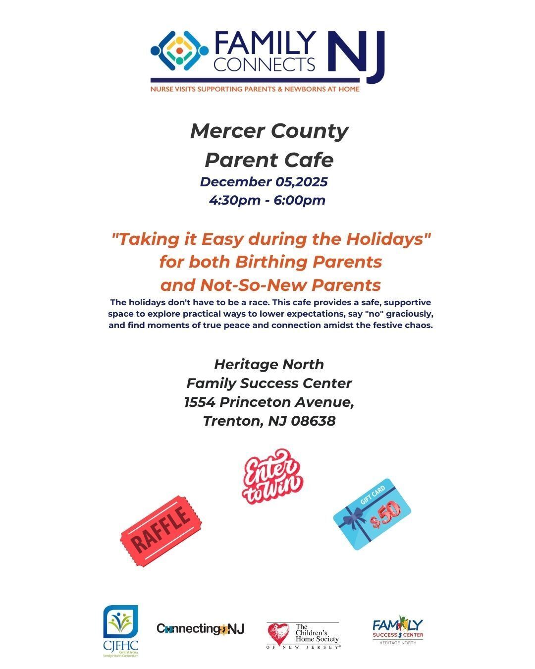 Join Connecting NJ's free Mercer County Parent Café for a warm, supportive conversation about managing holiday expectations and reducing stress as parents of infants and small children. This in-person session helps birthing parents and experienced parents learn practical ways to set boundaries, find balance, and enjoy meaningful moments during the busy season. No registration required.
