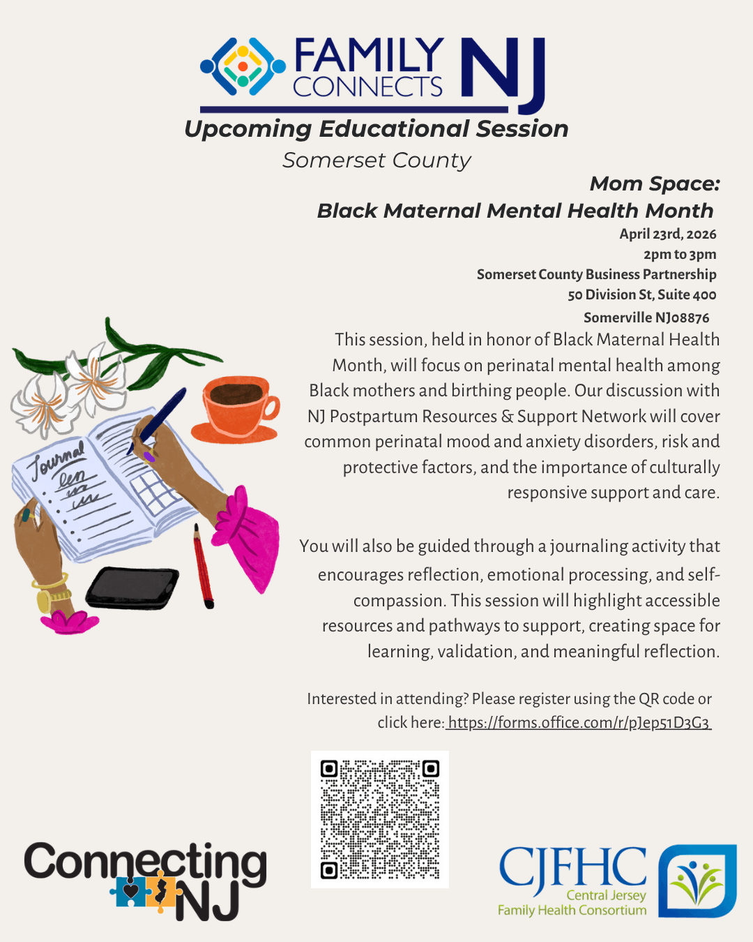 Join us for a supportive, in-person session focused on perinatal mental health among Black mothers and birthing people. This session includes guided journaling, discussion, and connections to culturally responsive resources.